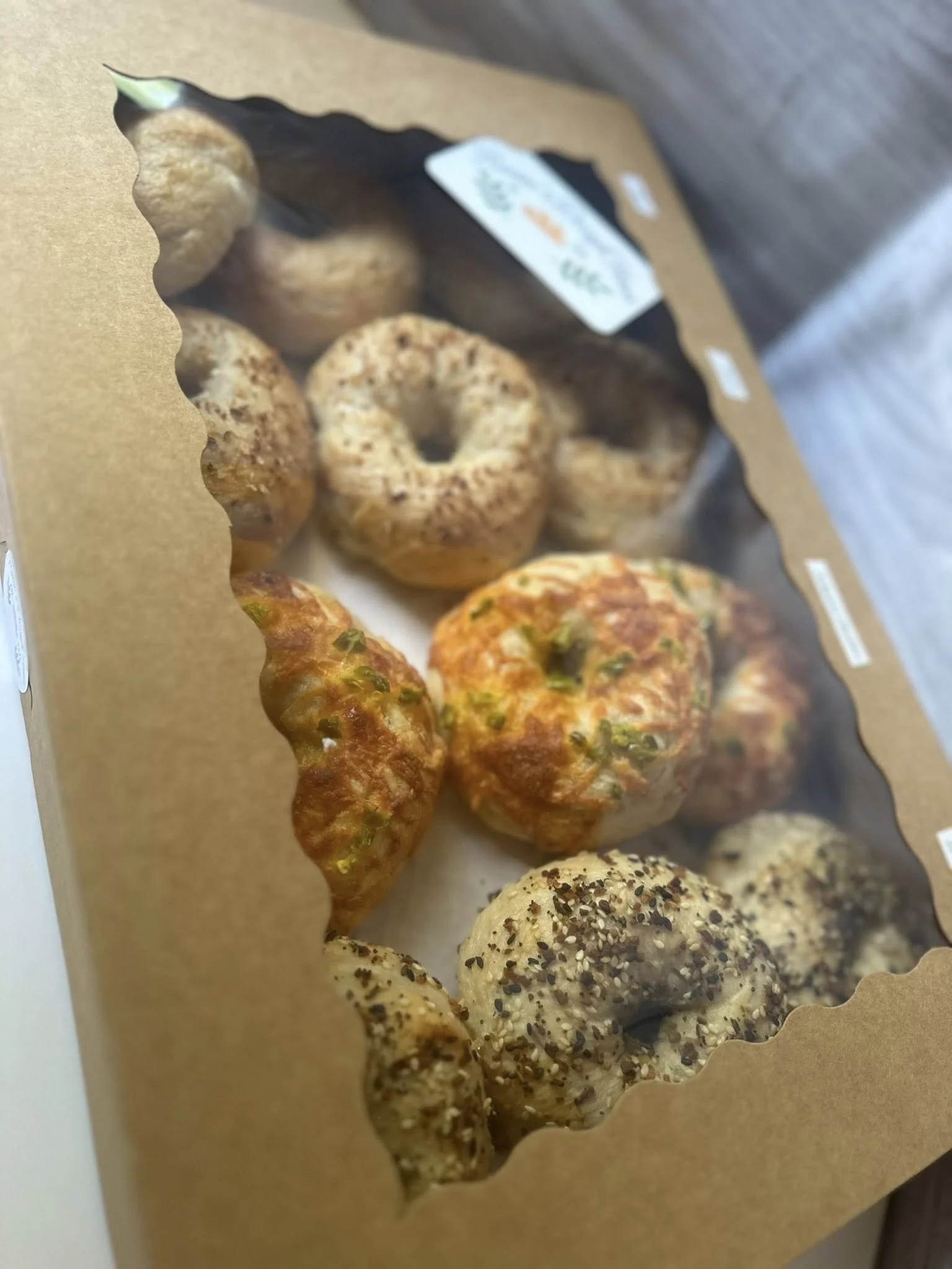 Cheddar, garlic parmesan, jalapeno cheddar, everything bagel, blueberry, honey cinnamon